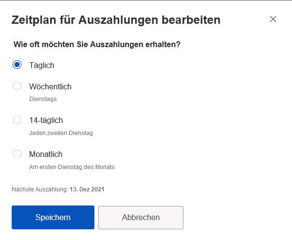 stell in der Zahlungsumgebung auf Tägliche Auszahlung.